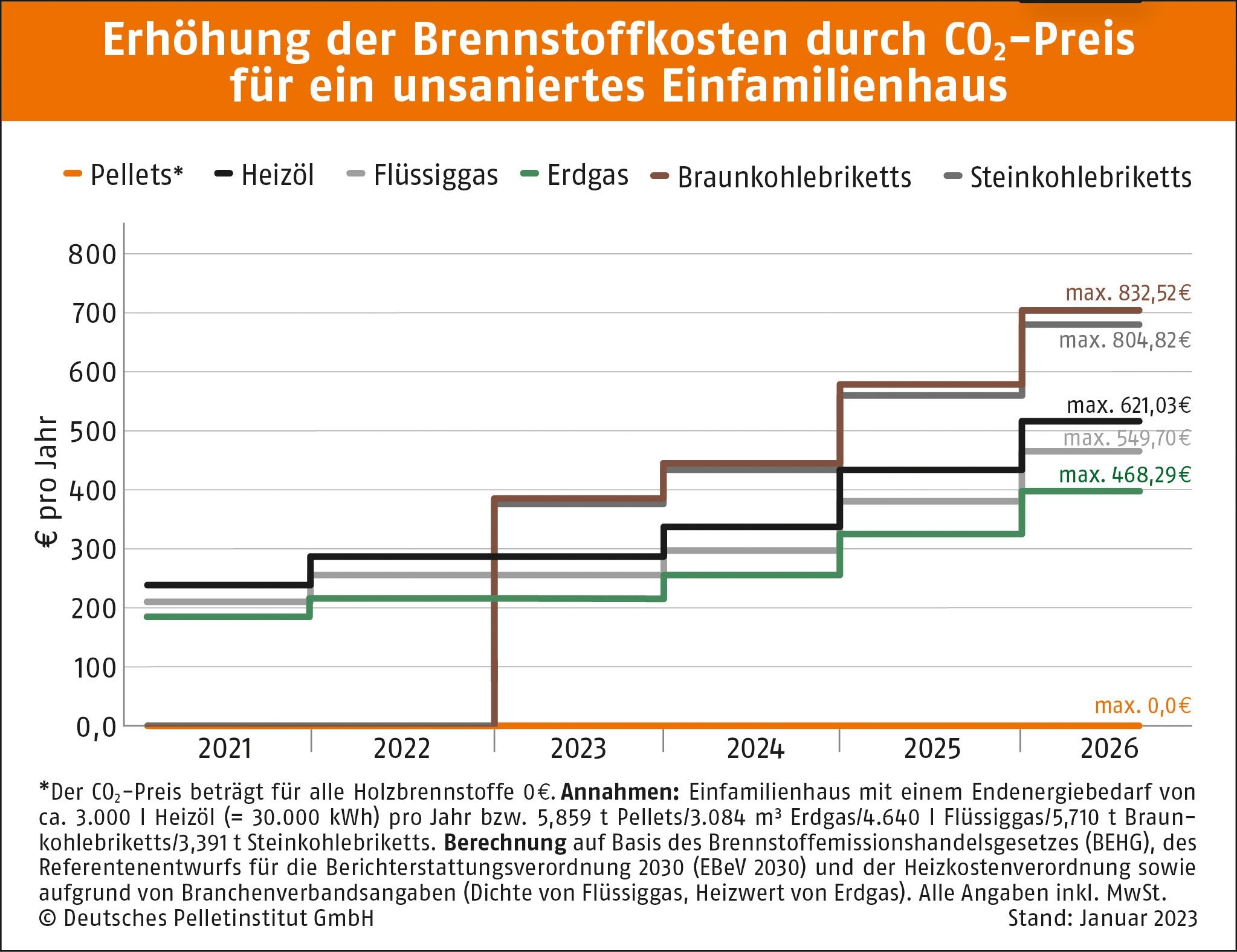 Erhöhung der Brennstoffkosten durch CO2-Preis für ein unsaniertes Einfamilienhaus