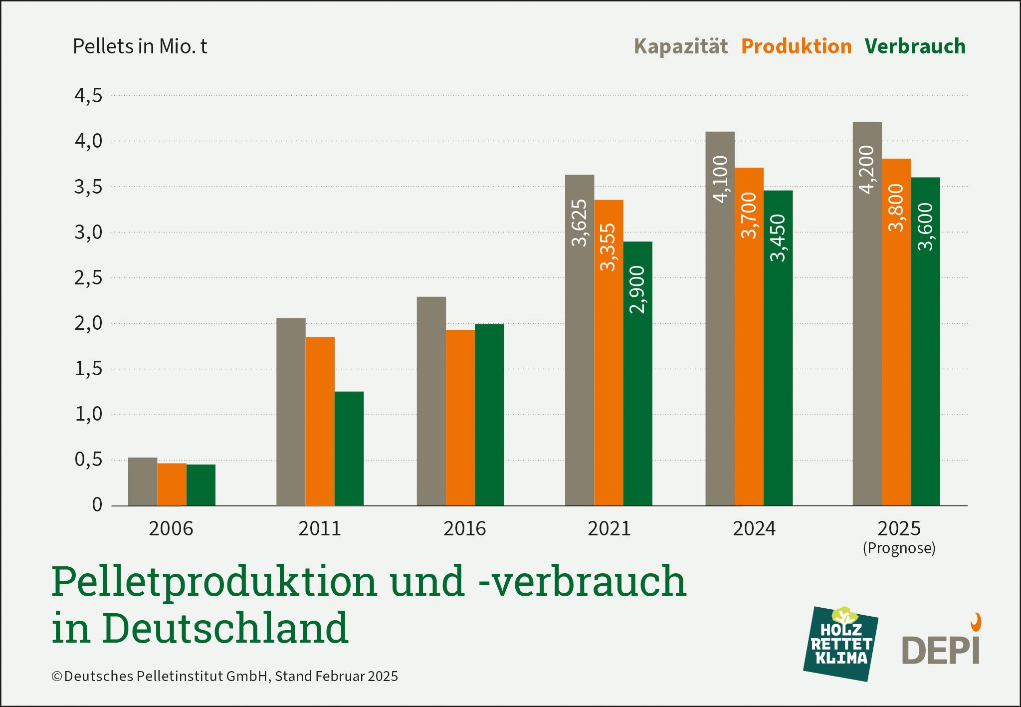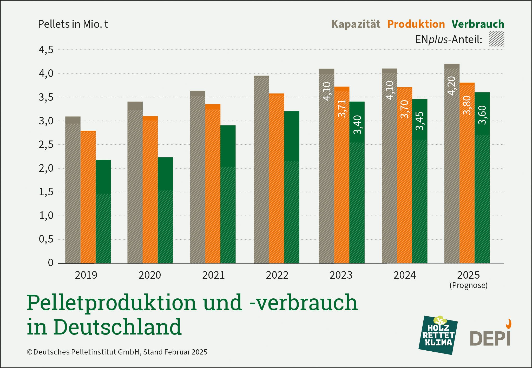 45 ENplus-zertifizierte Pelletproduzenten stellen an über 50 Standorten in Deutschland Holzpellets her. Bei der Produktion werden rd. 90 % Sägenebenprodukte verwendet, die im Sägewerk anfallen. Deutschland war in den letzten Jahren regelmäßig Nettoexporteur von Pellets – das heißt, dass rein rechnerisch mehr Pellets produziert als inländisch verbraucht wurden. Die Jahresproduktion der deutschen Pellethersteller liegt bei über 3 Millionen Tonnen im Jahr. Das Rohstoffpotential allein aus Sägenebenprodukten beträgt 6 bis 7 Millionen Tonnen – alternative Rohstoffe wie nicht-sägefähiges Rundholz sind noch nicht mitgerechnet.