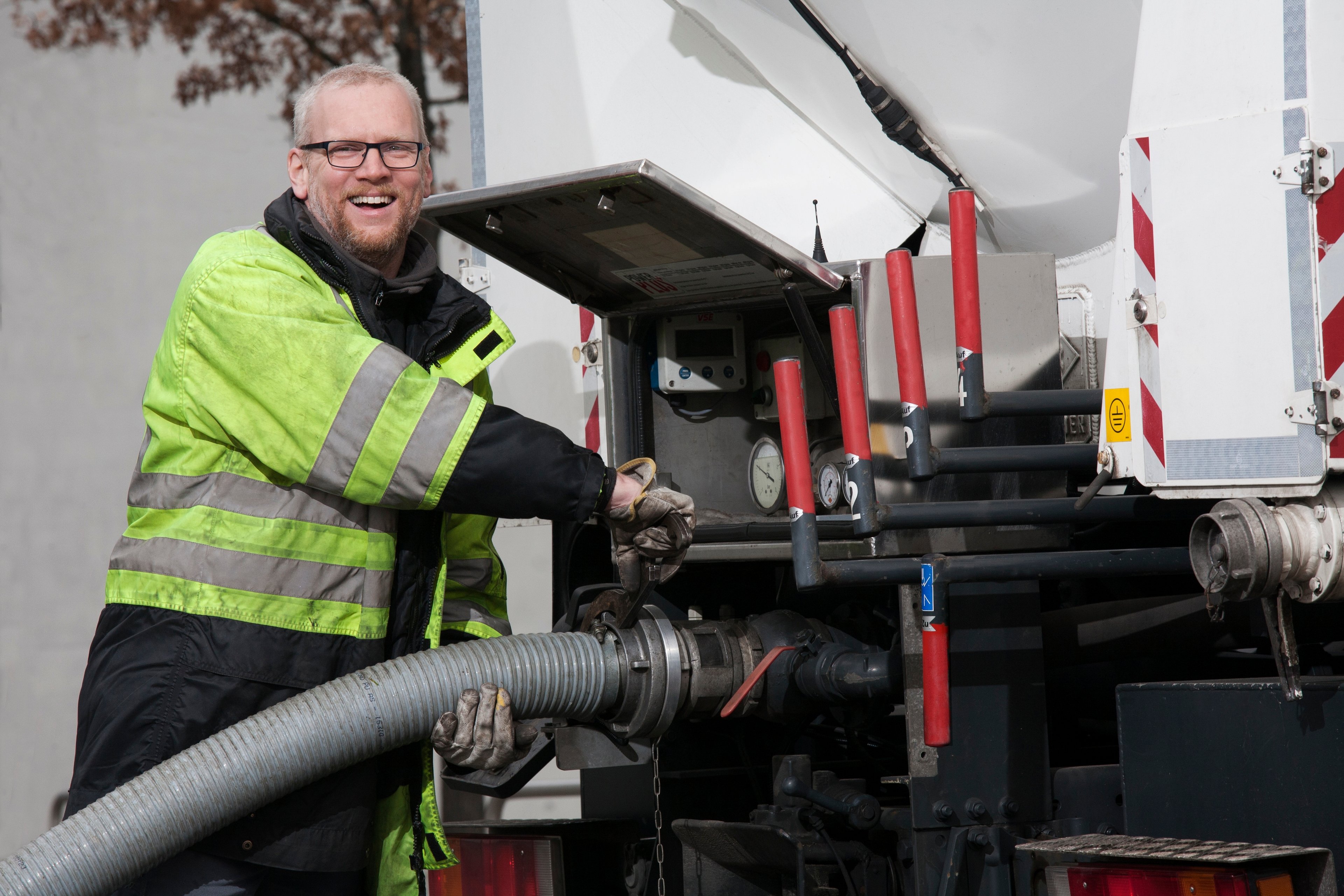 Der Schlauch muss richtig am LKW befestigt werden, um Pellets ins Lager einzublasen.